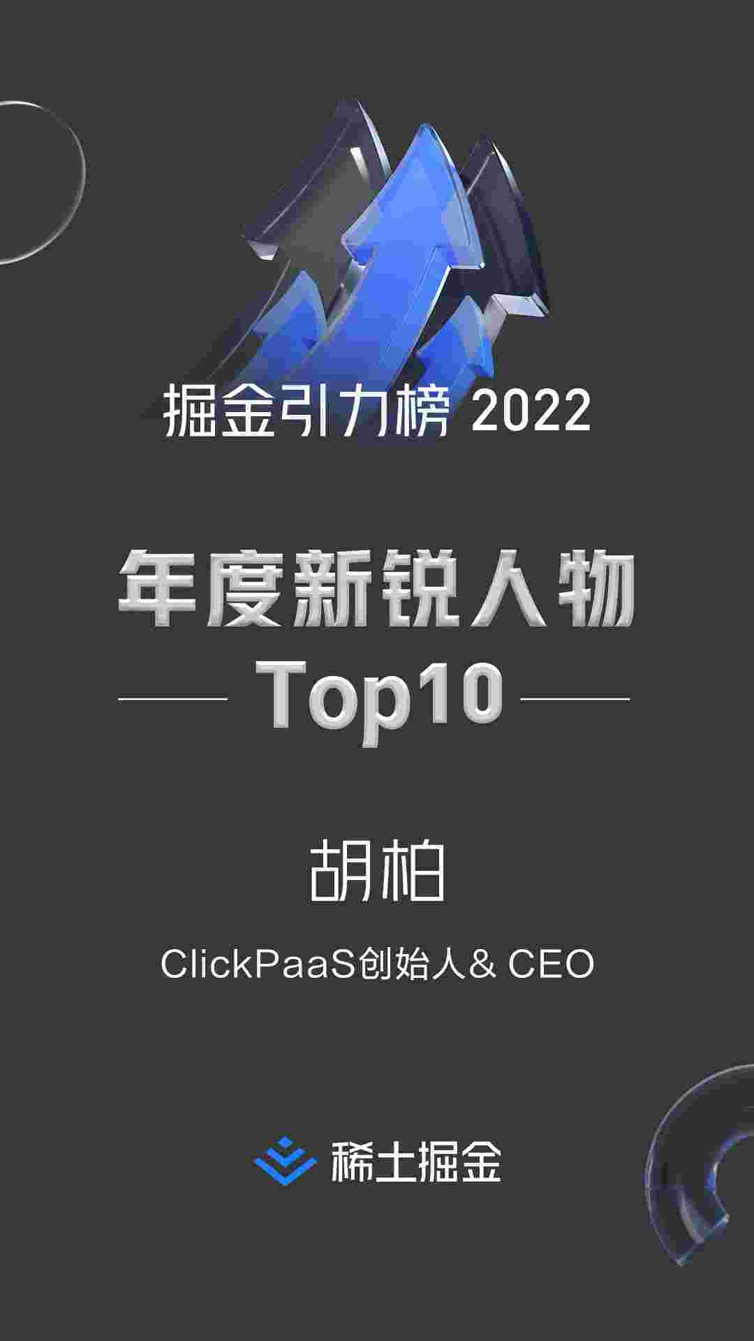 2022年1月6日,,,稀土掘金社区第一届「掘金未来大会」成功举办,,,会上发布了“2022 稀土掘金引力榜 年度新锐人物”榜单,,,上海爱湃斯科技有限公司(简称圆梦钱包)创始人及CEO胡柏实力入选年度新锐人物TOP 10。。